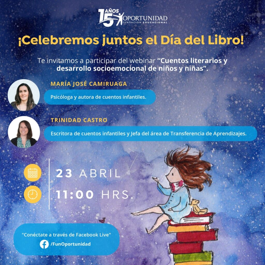 Para celebrar el día internacional del libro, Fundación Educacional Oportunidad realizó el webinar “Cuentos literarios y desarrollo socioemocional de niños y niñas”. En esta instancia, Trinidad Castro, escritora de libros infantiles y Jefa del Área de Transferencia de Fundación Educacional Oportunidad conversó con la psicóloga y autora de cuentos infantiles María José Camiruaga.